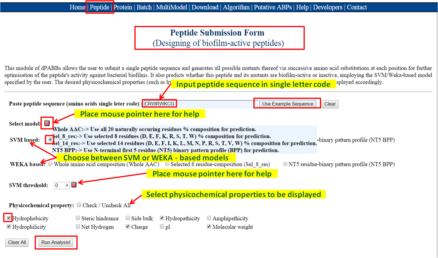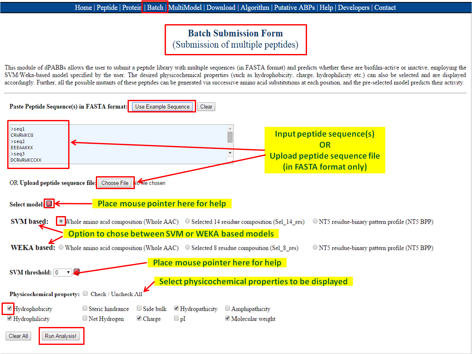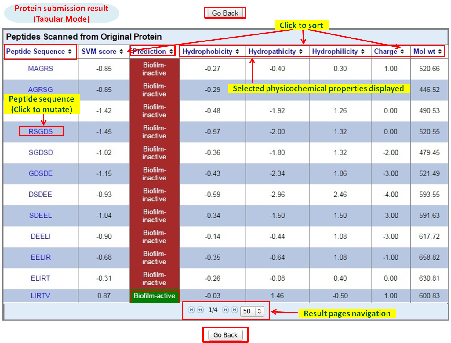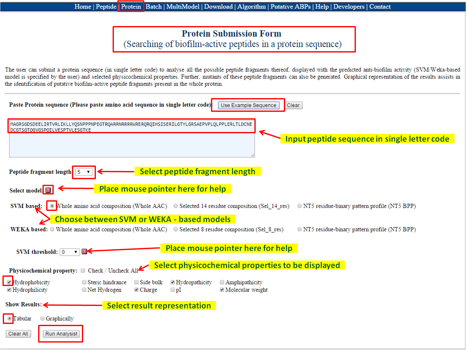 - Paste the protein (in single letter code, single line sequence only) in the input box. After submission, all possible peptides are generated containing putative anti-biofilm ability (in the form of SVM score / Weka probability) with physicochemical properties.