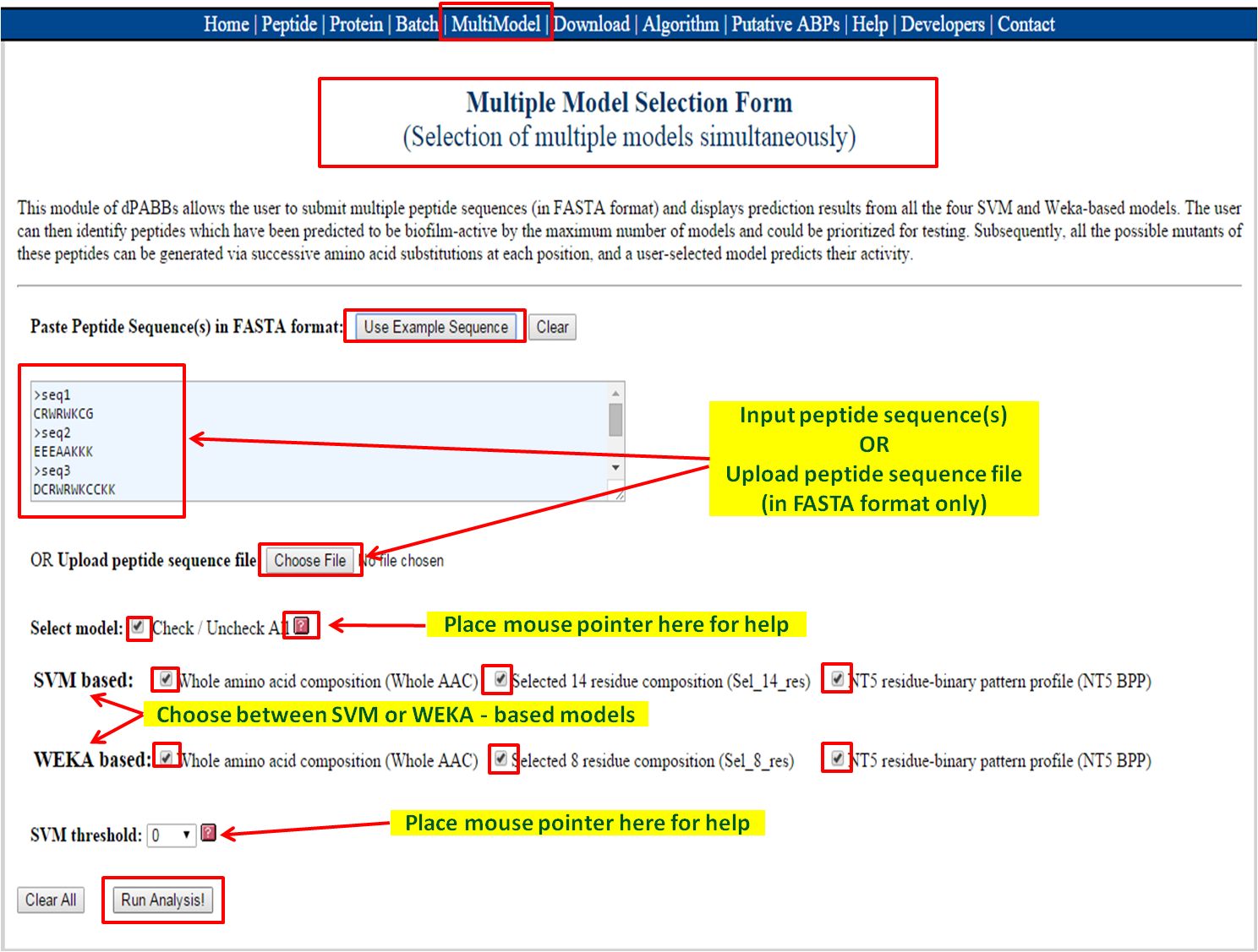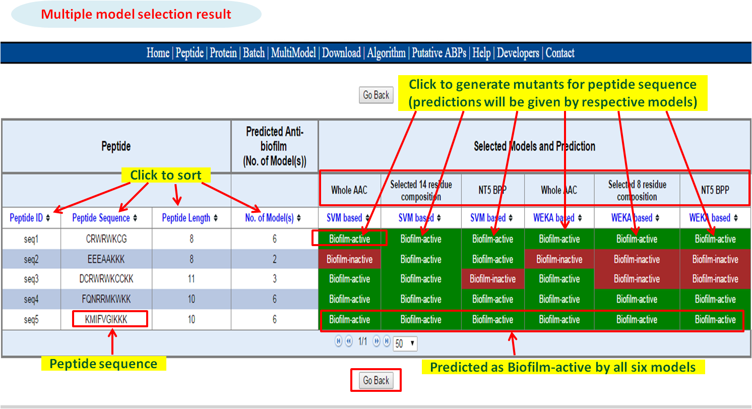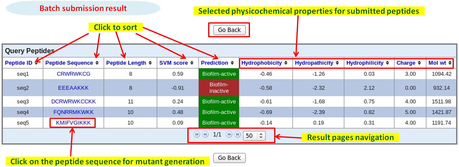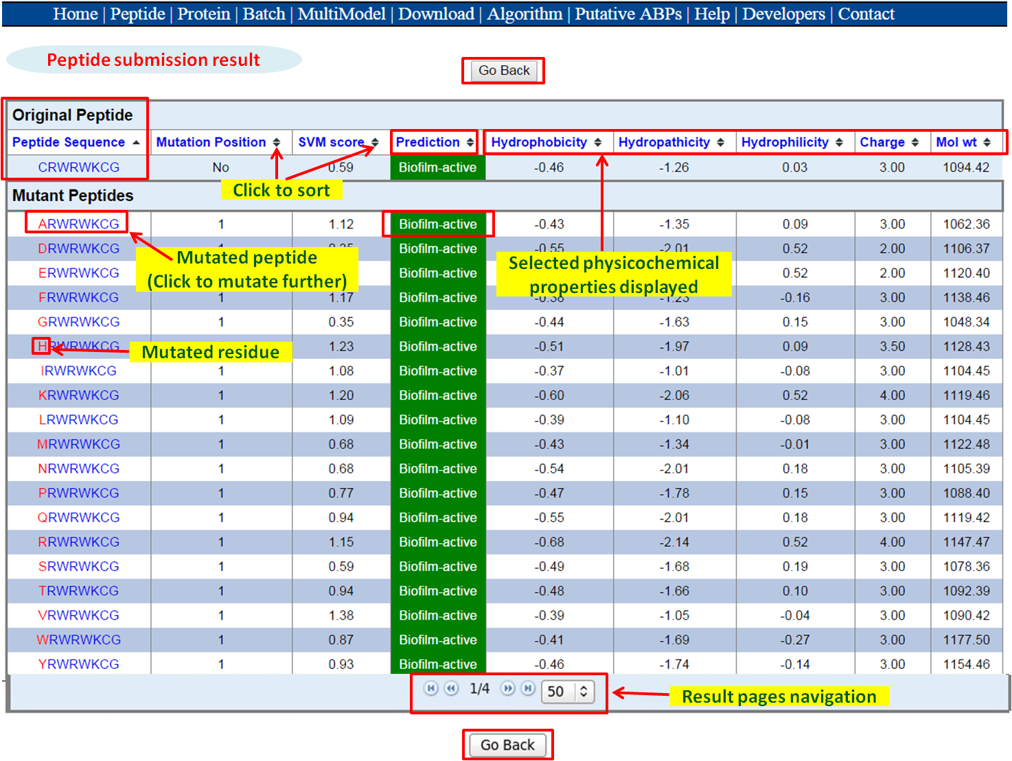 - Paste the protein (in single letter code, single line sequence only) in the input box. After submission, all possible peptides are generated containing putative anti-biofilm ability (in the form of SVM score / Weka probability) with physicochemical properties.