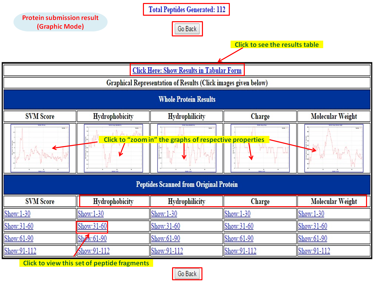 The other pattern is displayed for fragments which are generated from the submitted protein. The predicted bioactivity value (SVM score / Weka probability) accompanied with physicochemical properties (Hydrophobicity, Hydrophilicity, Charge, Molecular weight) and the peptide fragments for that protein are displayed. On clicking the peptide fragments, the predicted bioactivity scores / properties are displayed in graphical form. |